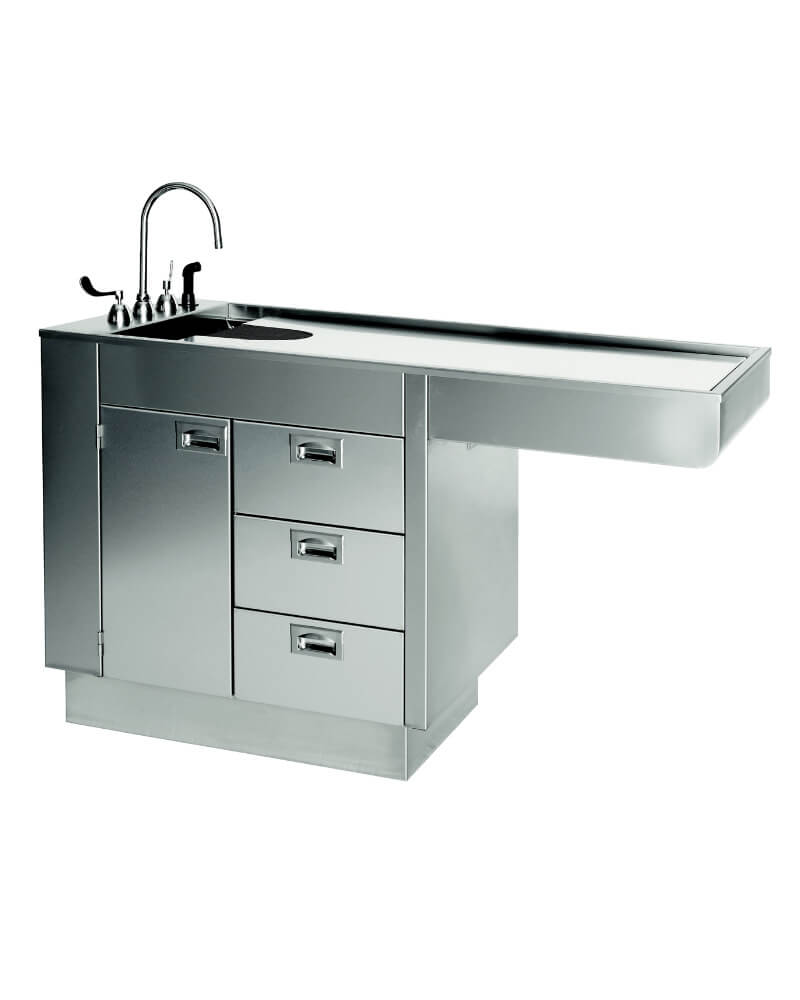 Choose an all stainless steel VetLine Wet Table for superior performance. This 6″ deep VetLine Wet Table provides you flexibility for all your daily surgical procedures and dental services, as well as your other daily needs. The heavy-duty liner is 6″ deep and measures 60″L x 24″W. The liner features radius corners to eliminate all seams and welds. This all stainless steel wet table is constructed of 16 gauge, 304 grade stainless. We use all stainless hardware, which includes all latches, hinges and handles. The base includes 1 large cabinet, 3 full extension drawers. This unit has a knee space for added convenience and comfort for sitting during procedures. A stainless-steel prep rack is included.