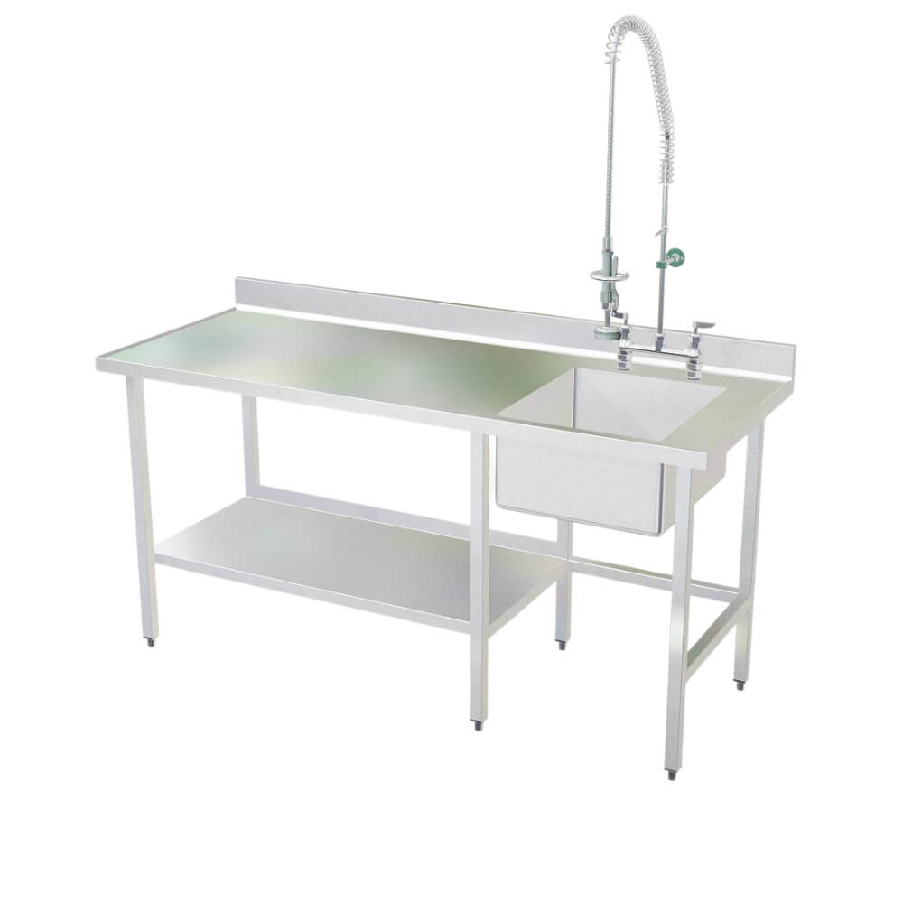 Constructed of heavy-duty 16 gauge 304 stainless steel. The raised marine edge contains water and spills on the table top allowing liquids to drain back into the sink eliminating frequent cleanup of the floor. Overall dimensions are 72″L x 28″D x 40″H including the backsplash. Table surface is 36″ off the floor. The welded under shelf is 48″L x 24″D with the top surface 10″ off the floor and includes a 1″ backsplash. The sink bowl is 18″L x 20″D x 10″H. (Specify left or right mounting.) The legs are constructed of 1-1/2″ square stainless steel tubing and have adjustable flanged bullet feet. Easy clean stainless steel withstands water and will last a lifetime.
